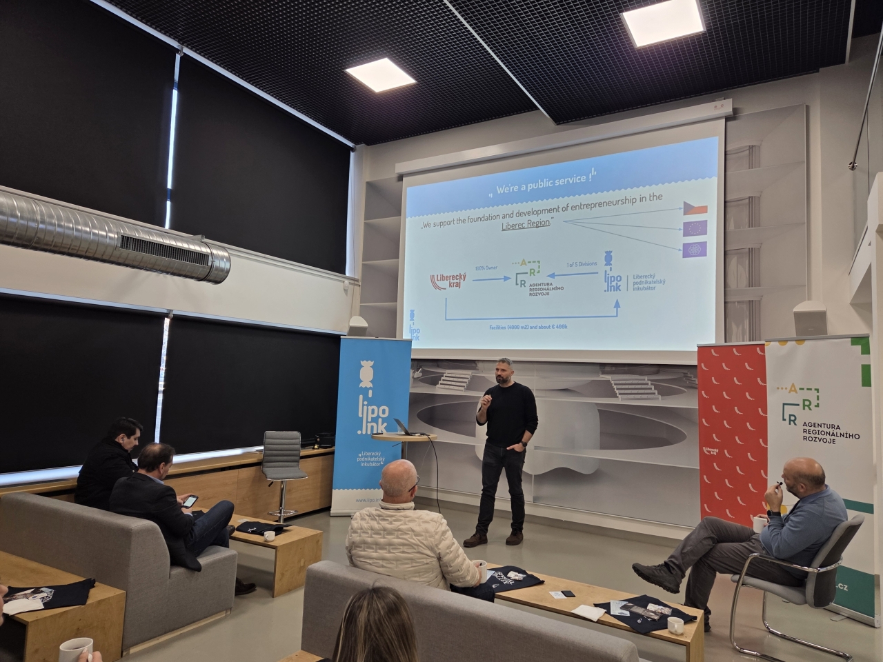 Poté se již celá skupina přesunula do prostor libereckého inkubátoru. Tady byla představena činnost Agentury regionálního rozvoje (ARR), kterou zřídil a vlastní Liberecký kraj. ARR realizuje v regionu široké portfolio služeb – vedle inkubátoru Lipo.ink taky značku Crystal Valley a nově krajskou destinační značku, program LK Sobě, podporu sociálního podnikání, Smart Akcelerátor Libereckého kraje či aktivity na podporu digitalizace s využitím EDIH Northeast a další projekty.