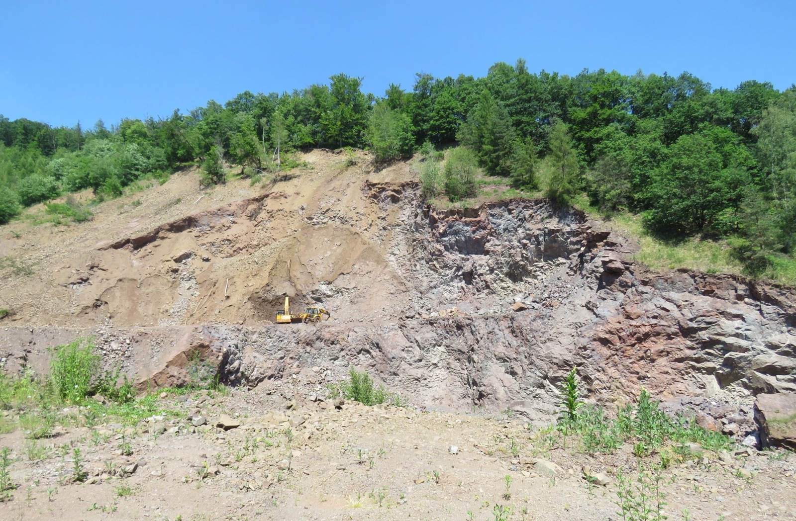 Fotografie: Roztěžená část ložiska stavebního kamene s patrnými různě zbarvenými proudy melafyrů.