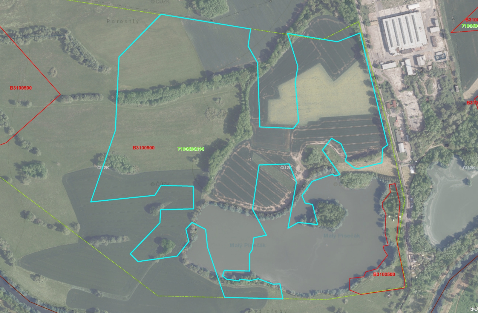 Letecký snímek: nedotčené a vytěžené bloky zásob ložiska štěrkopísku Příšovice